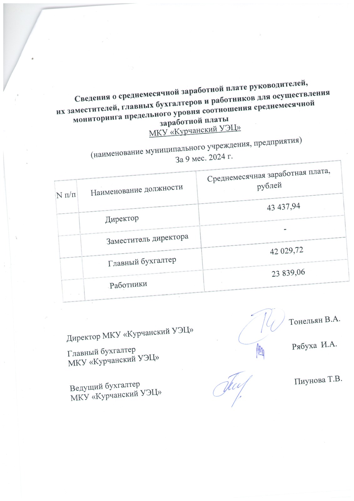 Сведения о среднемесячной заработной плате руководителей, их заместителей, главных бухгалтеров и работников для осуществления мониторинга предельного уровня соотношения среднемесячной заработной платы МКУ «Курчанский УЭЦ»