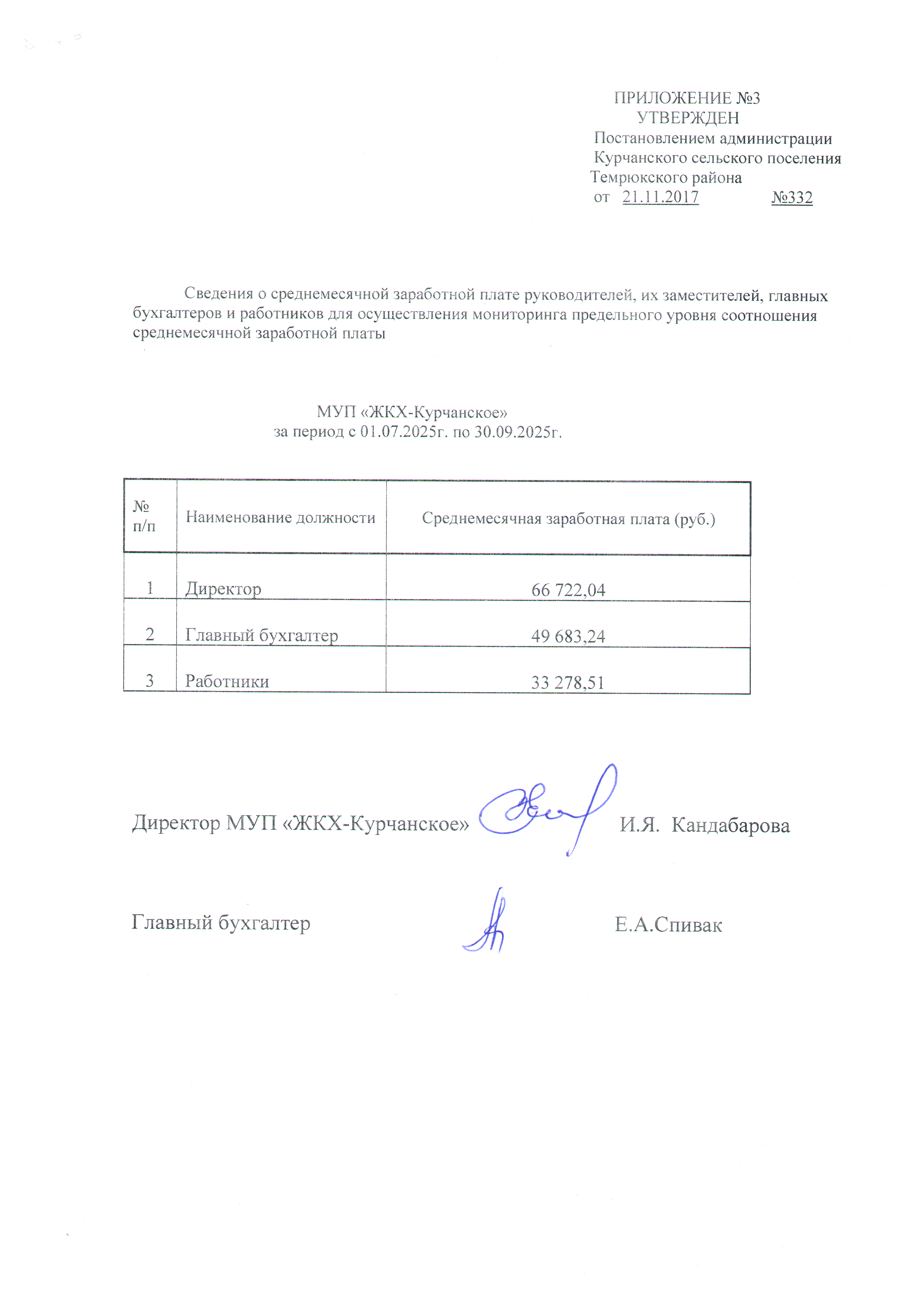 Сведения о ежемесячной заработной плате руководителей, их заместителей, главных бухгалтеров и работников для осуществления мониторинга предельного уровня соотношения среднемесячной заработной платы МУП "ЖКХ-Курчанское" за период с 01.07.2025 по 30.09.2025