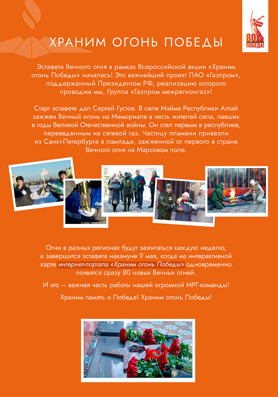 К 80-летию Победы в Великой Отечественной войне «Газпром межрегионгаз» реализует масштабный проект — Всероссийская акция «Храним огонь Победы» ПАО «Газпром» — по переводу более 120 мемориалов на сетевой природный газ. Начиная с 21 февраля еженедельно проводятся подключения Вечных огней к сетям газораспределения. Завершится эстафета в канун 9 мая торжественной церемонией одновременного зажжения еще 80 огней на новых и реконструированных мемориальных комплексах.
