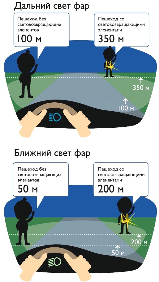 Более 90% наездов на пешеходов с тяжелыми последствиями совершается в темное время суток (вечером или ночью). Улучшение видимости пешехода становится одним из важнейших способов предотвращения дорожно-транспортных происшествий с их участием. На 70% уменьшается риск гибели для пешеходов при применении световозвращающих элементов. Световозвращающие элементы – это элементы, изготовленные из специальных материалов, обладающих способностью возвращать луч света обратно к источнику. Водитель при движении автомобиля со скоростью около 40 км/ч с использованием ближнего света фар может заметить пешехода на расстоянии около 25 метров, что не дает ему возможности успеть затормозить и избежать наезда. Если пешеход использовать световозвращающие элементы, то водитель имеет возможность заметить его с расстояния, превышающего 150 метров.