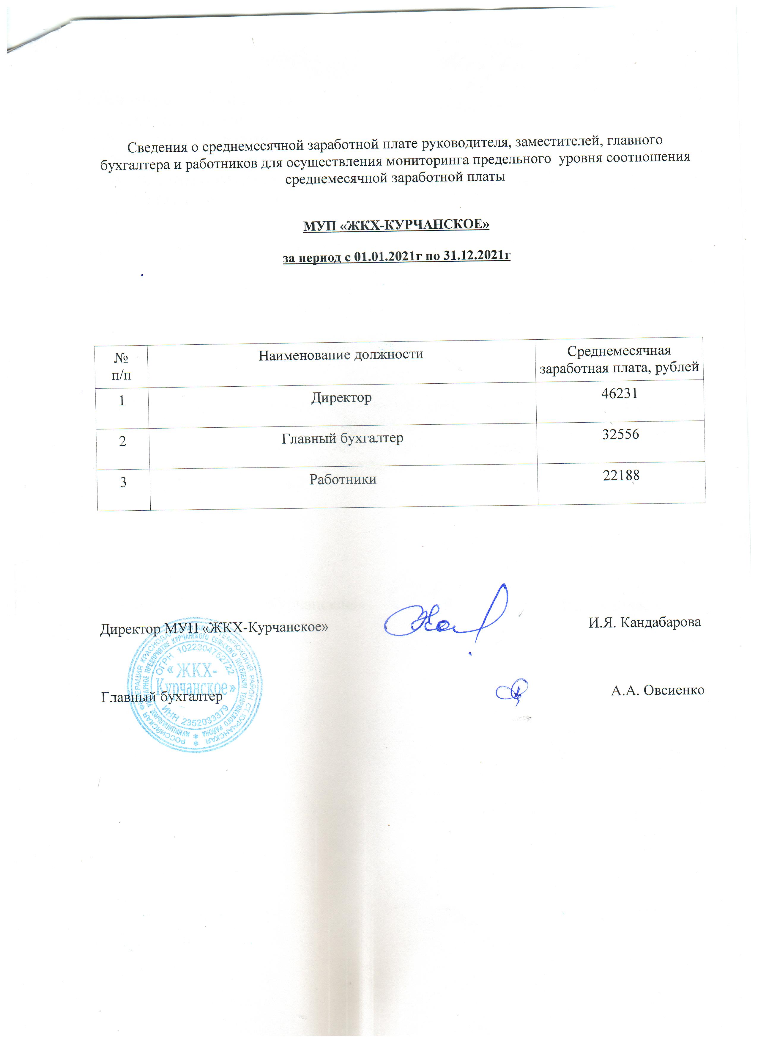Сведения о среднемесячной заработной плате руководителя, заместителей, главного бухгалтера и работников для осуществления мониторинга предельного уровня соотношения среднемесячной заработной платы МУП «ЖКХ-КУРЧАНСКОЕ» за период с 01.01.2021г по 31.12.2021г