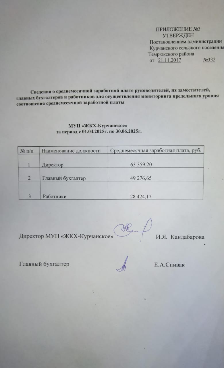 Сведения о среднемесячной заработной плате руководителей, их заместителей, главных бухгалтеров и работников для осуществления мониторинга предельною уровня соотношении среднемесячной заработной платы МУП «ЖКХ-Курчанское» за период с 01.04.2025г. по 30.06