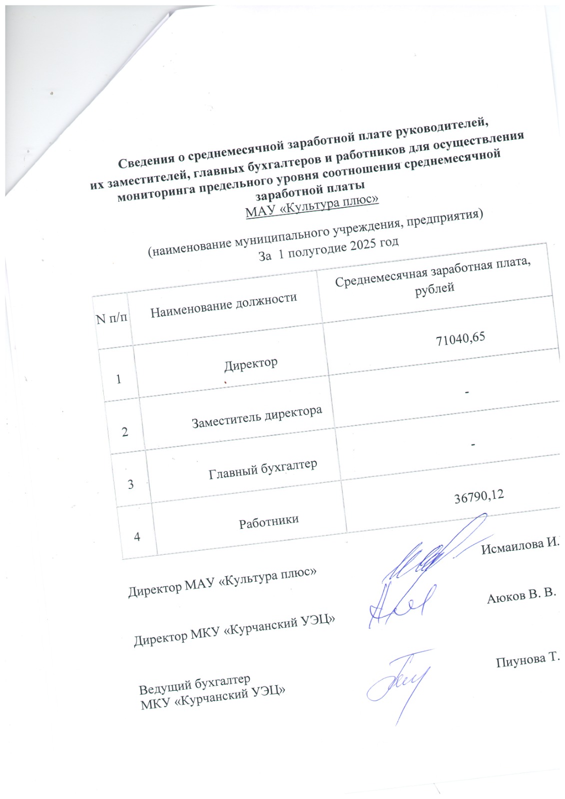 Сведения о среднемесячной заработной плате руководителей, их заместителей, главных бухгалтеров и работников для осуществления мониторинга предельною уровня соотношении среднемесячной заработной платы МАУ «МАУ КУЛЬТУРА-ПЛЮС»