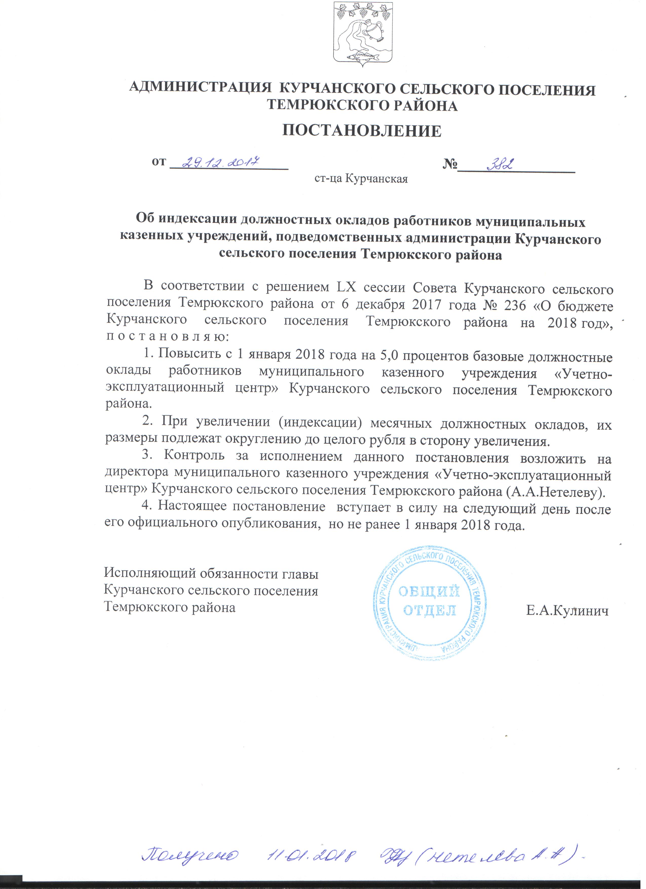 ПОСТАНОВЛЕНИЕ от 29.12.2017 № 382 Об индексации должностных окладов работников муниципальных казенных учреждений, подведомственных администрации Курчанского сельского поселения Темрюкского района