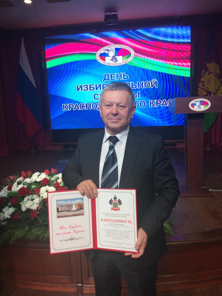 За успешную работу по подготовке и проведению избирательных кампаний в Российской Федерации,за вклад в развитие избирательной системы, участие в подготовке и проведении выборов в органы государственной власти Российской Федерации и Краснодарского края, органы местного самоуправления в Краснодарском крае, высокопрофессиональную деятельность, направленную на соблюдение избирательных прав и свобод граждан в Краснодарском крае Центральной избирательной комиссий Российской Федерации и Законодательным Собранием Краснодарского края направлены благодарности председателю территориальной избирательной комиссии Темрюкская Юрию Васильевичу Левому.