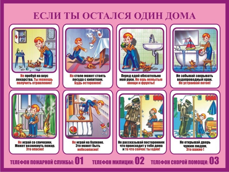 Если ты остался один дома, не открывай посторонним людям дверь, даже если это твои соседи. Если человек за дверью представился знакомым твоих родителей, или работником полиции, почты, попроси зайти их позже, назвав время прихода твоих родителей. Если пришедший человек говорит, что пришла срочная телеграмма, попроси ее зачитать, но не открывай дверь. Если тебе говорят, что ты заливаешь соседей снизу, скажи, что сейчас к ним придут, а сам проверь, нет ли воды на полу в ванной, туалете и кухне, позвони родителям или родственникам, живущим поблизости, и пусть они сходят к соседям ниже этажом.