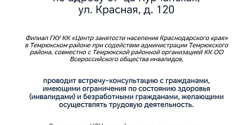 13 августа 2025 Проводится встреча-консультация с гражданами, имеющими ограничения по состоянию здоровья (инвалидами) и безработными гражданами, желающими осуществлять трудовую деятельность