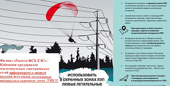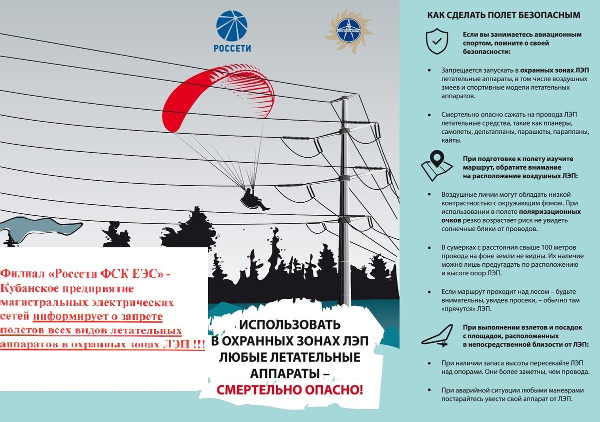 Кубанское предприятие магистральных электрических сетей обращается к руководителям сельхозпредприятий, фермерских хозяйств, а также к лицам, занимающимся авиационным спортом и ко всем жителям Краснодарского края с просьбой о недопустимости полетов с применением пилотируемых (самолетов, вертолетов), а также непилотируемых летательных аппаратов всех видов, вблизи воздушных линий электропередач, которые могут привести к авариям и гибели людей в охранной зоне ЛЭП.